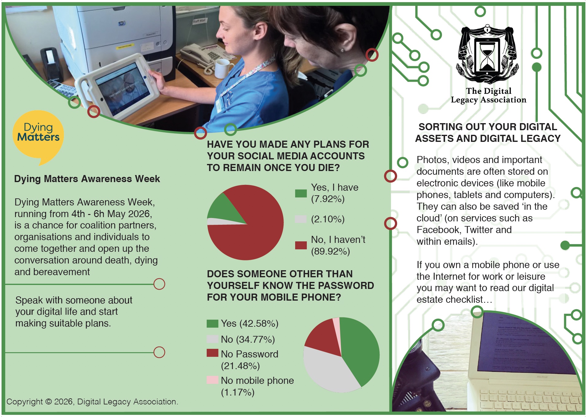 Our Digital Assets and Digital Legacy poster can also be downloaded for free, printed and displayed to evoke thought in hospices, hospitals and in alternative spaces.